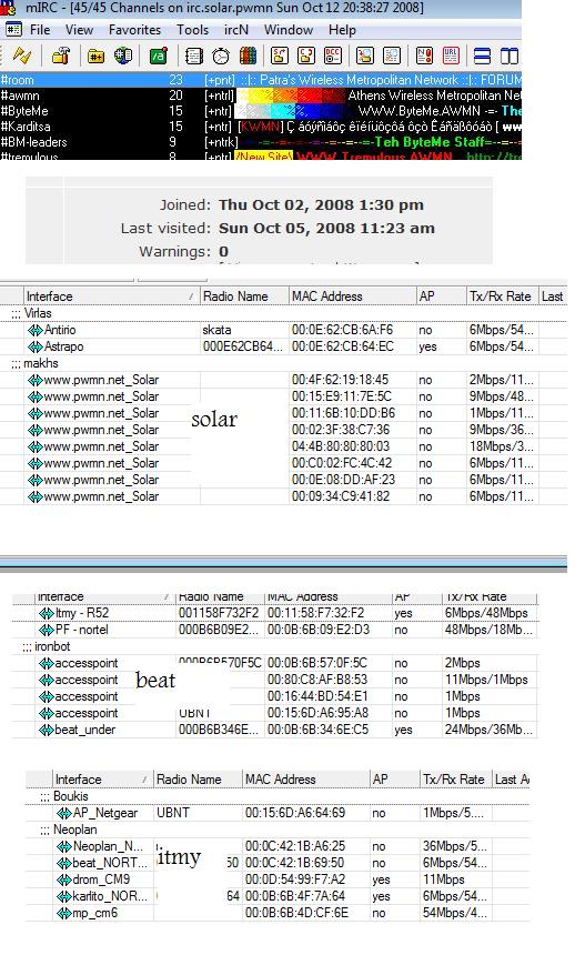 Η παρακάτω εικόνα απεικονίζει 1 ss απο το irc του Hellas Wireless Network..1 ss απο τον τελευταίο χρήστη του forum μας (πότε γράφτηκε πότε μπήκε να μας ξαναδιαβάσει) και 3 ss apo το wilress tab 3ών απο τους 36 (μπορεί και παραπάνω) κόμβους που απαρτίζουν το δίκτυο.