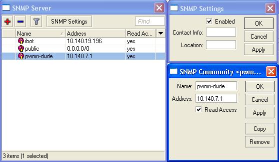 Aρκει να προσθεσετε (το mikrotik εχει by default, αρα το εχετε διαγραψει ή δεν εχετε ενεργοποιησει το snmp server) ενα community pwmn-dude στο 10.140.7.1. Να τονισω οτι πρεπει να το κανετε στο mikrotik σας ΟΠΩΣ ΑΚΡΙΒΩΣ ειναι στο screenshot, δηλαδη ολοι πρεπει να εχουν σαν community το pwmn-dude και στην ip την 10.140.7.1 , δηλαδη αυτη που βρισκεται ο dude server!